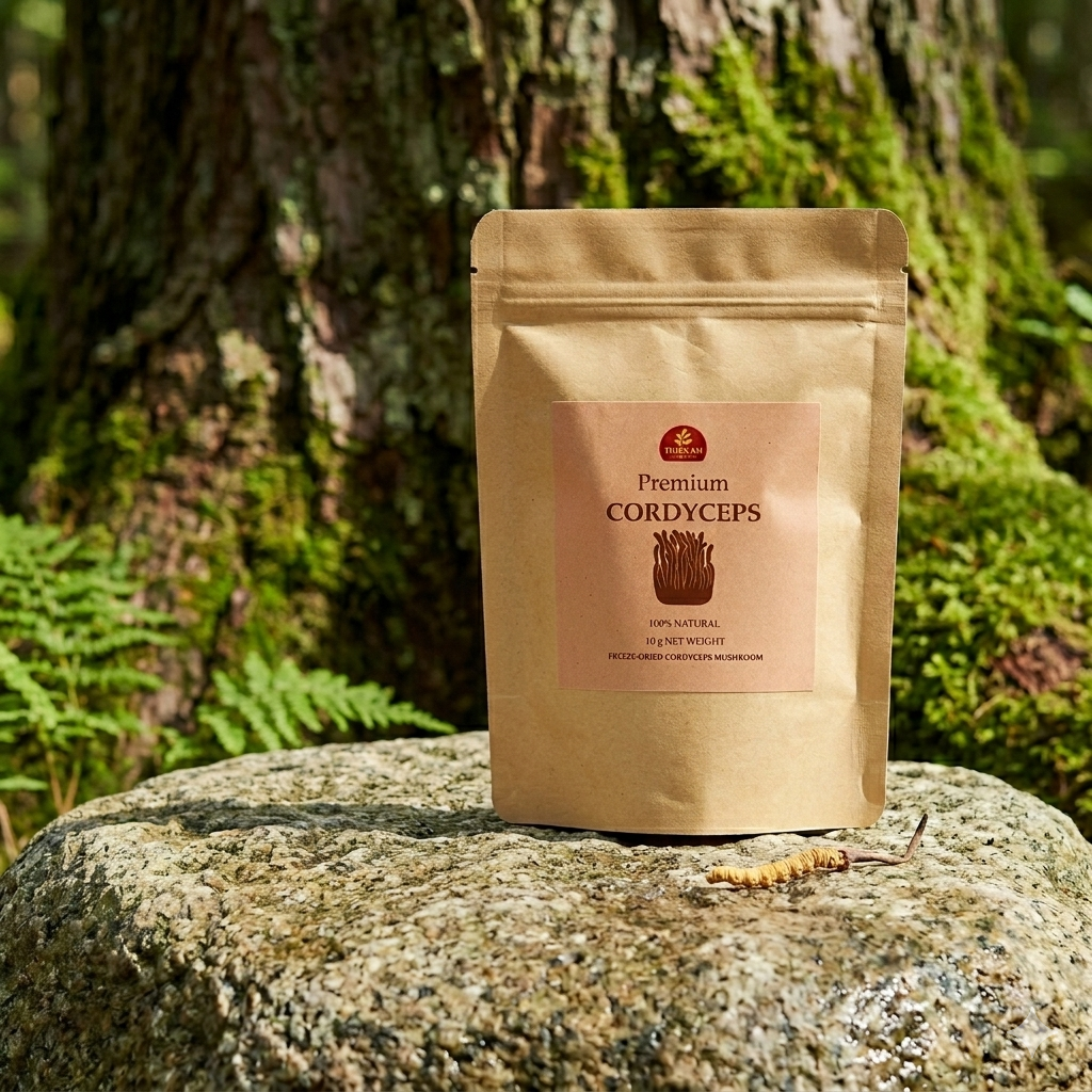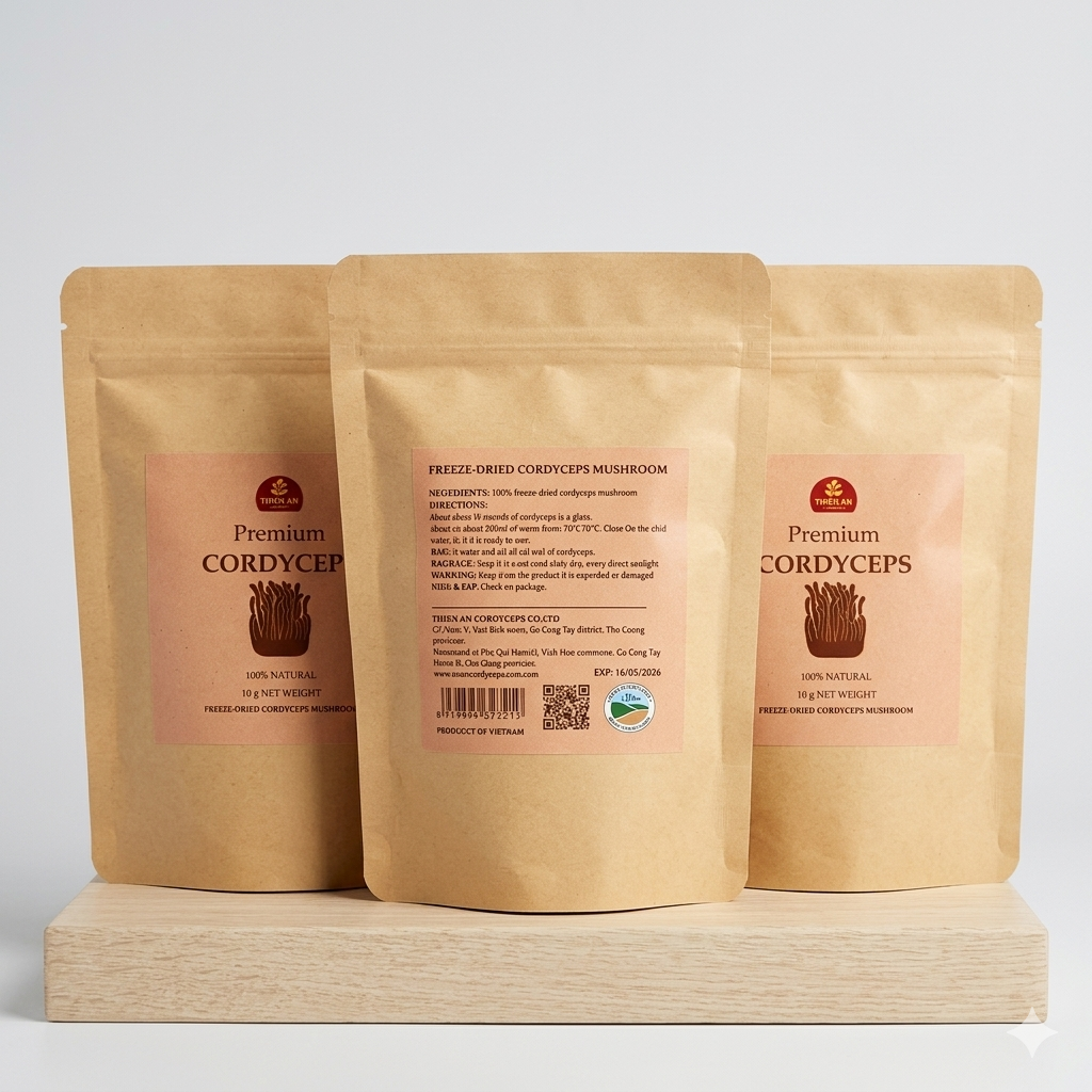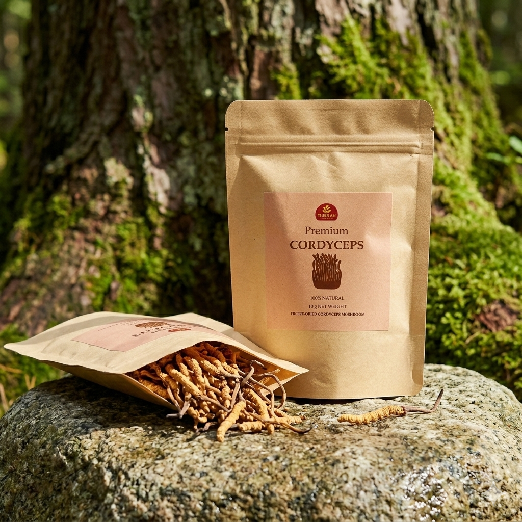 Nguyên liệu Thiên nhiên 100%: Chúng tôi cam kết sử dụng 100% bột Nấm Đông Trùng Hạ Thảo tự nhiên, không pha trộn tạp chất hay hóa chất nhân tạo.